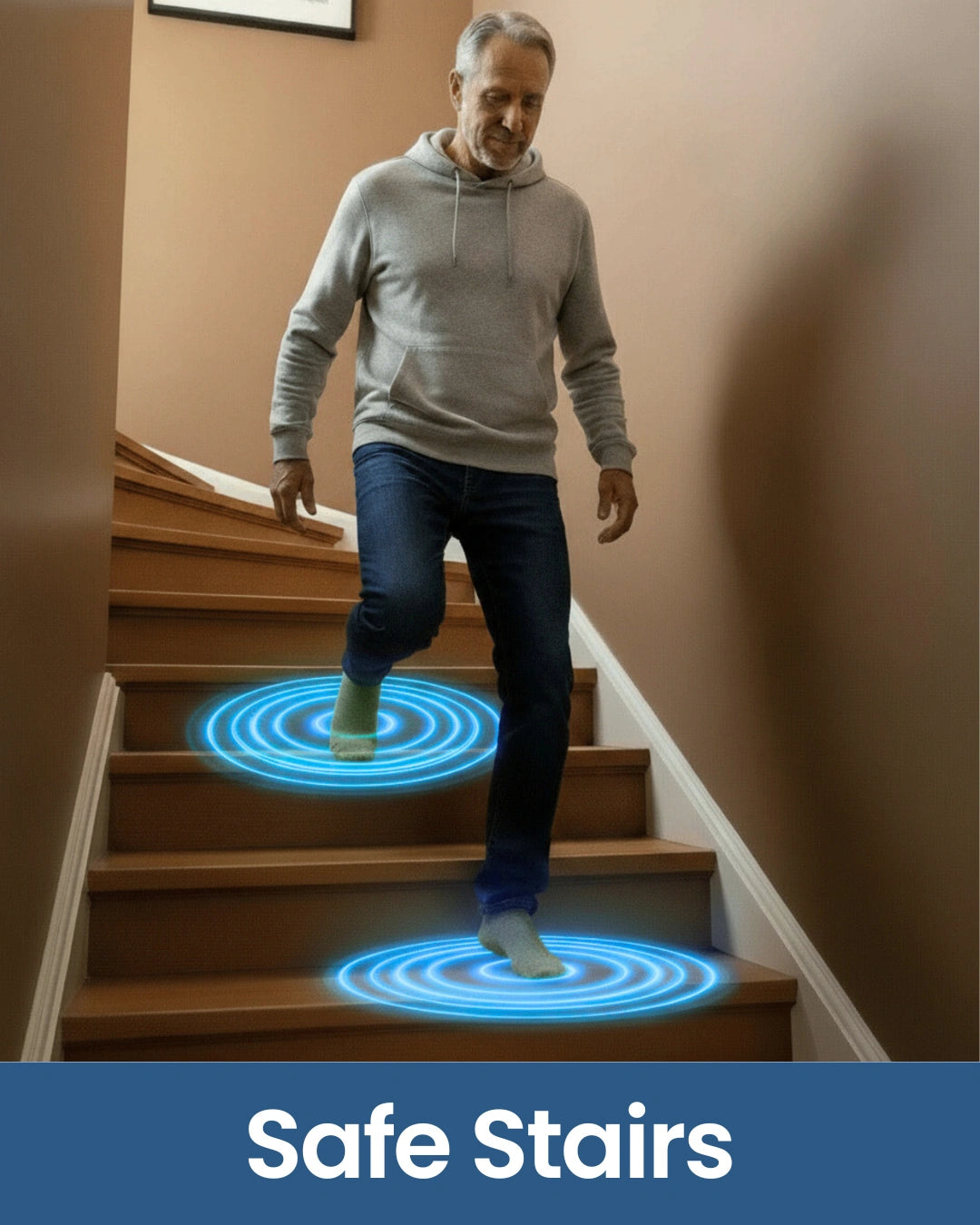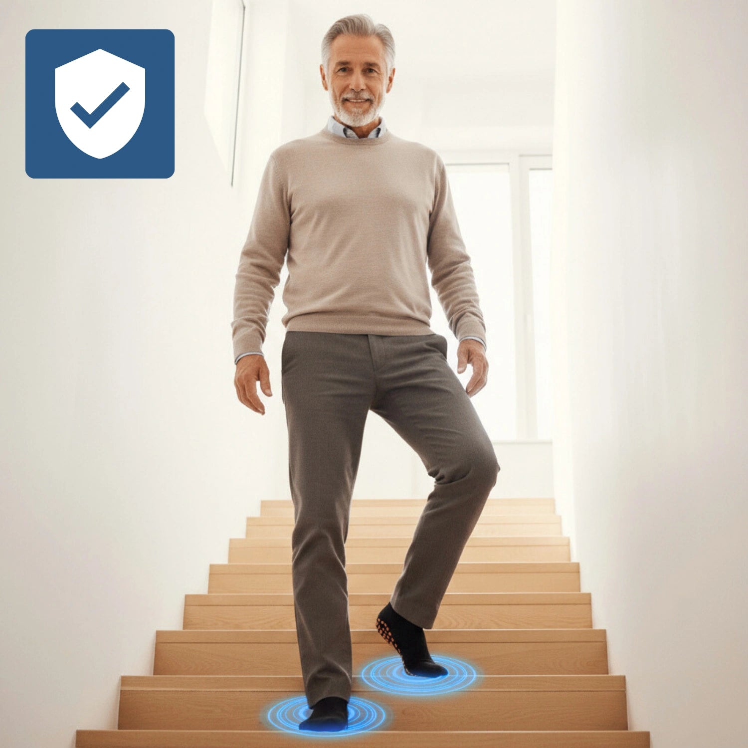 Hundreds of grip points provide superior stability on any surface. Unlike bulky slippers that isolate feet, Steadies preserve direct floor contact - essential for natural balance and long-term mobility.